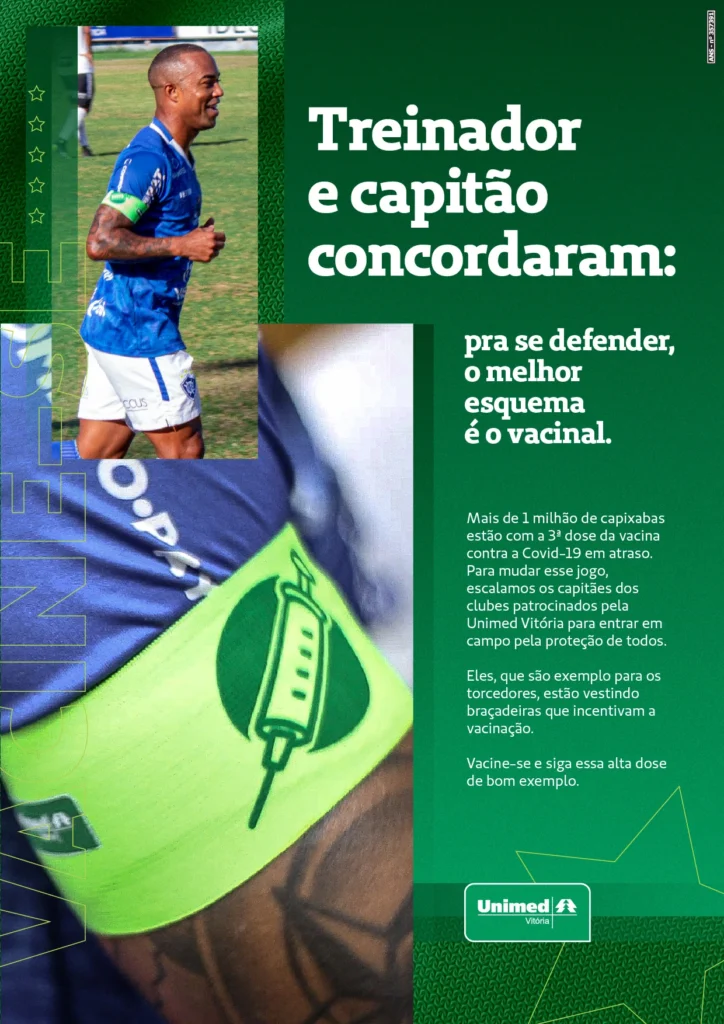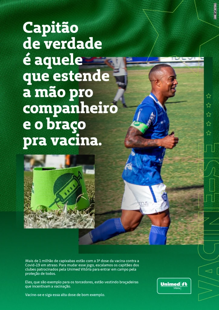 1 milhão de capixabas estavam com doses da vacina contra a Covid-19 atrasada. Para mudar esse jogo, os jogadores dos times patrocinados pela Unimed arregaçaram as mangas para contra-atacar a desinformação. E os capitães foram além: vestiram o símbolo de uma alta dose de bom exemplo.